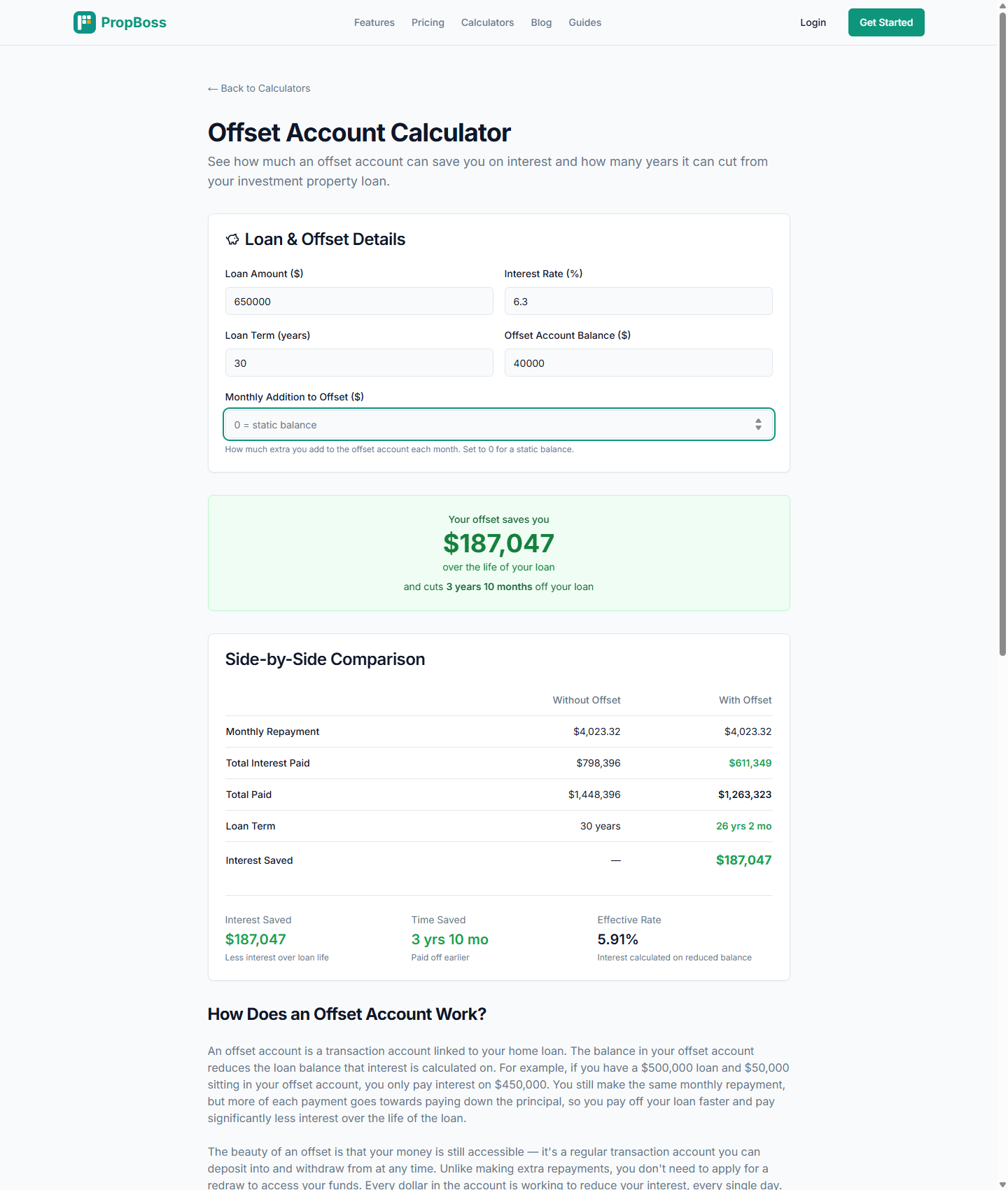 Using the same numbers in the live PropBoss offset calculator, a $650,000 loan at 6.30% with a static $40,000 offset balance over 30 years shows about $187,047 less interest paid over the loan life and the loan finishing roughly 3 years 10 months earlier.