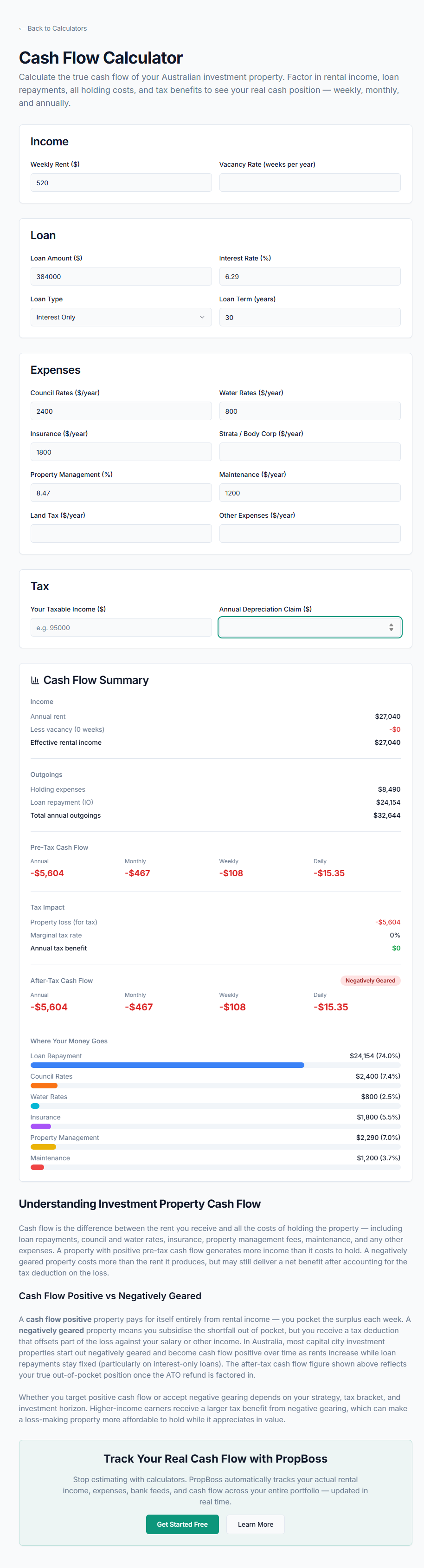 PropBoss tracks cash flow across investment properties with automated bank feeds, depreciation schedules, and ATO-compliant reporting. The Cash Flow Calculator handles income, expenses, loan repayments, management fees, and tax savings, so you can see whether each property is a positive cash flow property or a loss-making one. Start your free trial ->