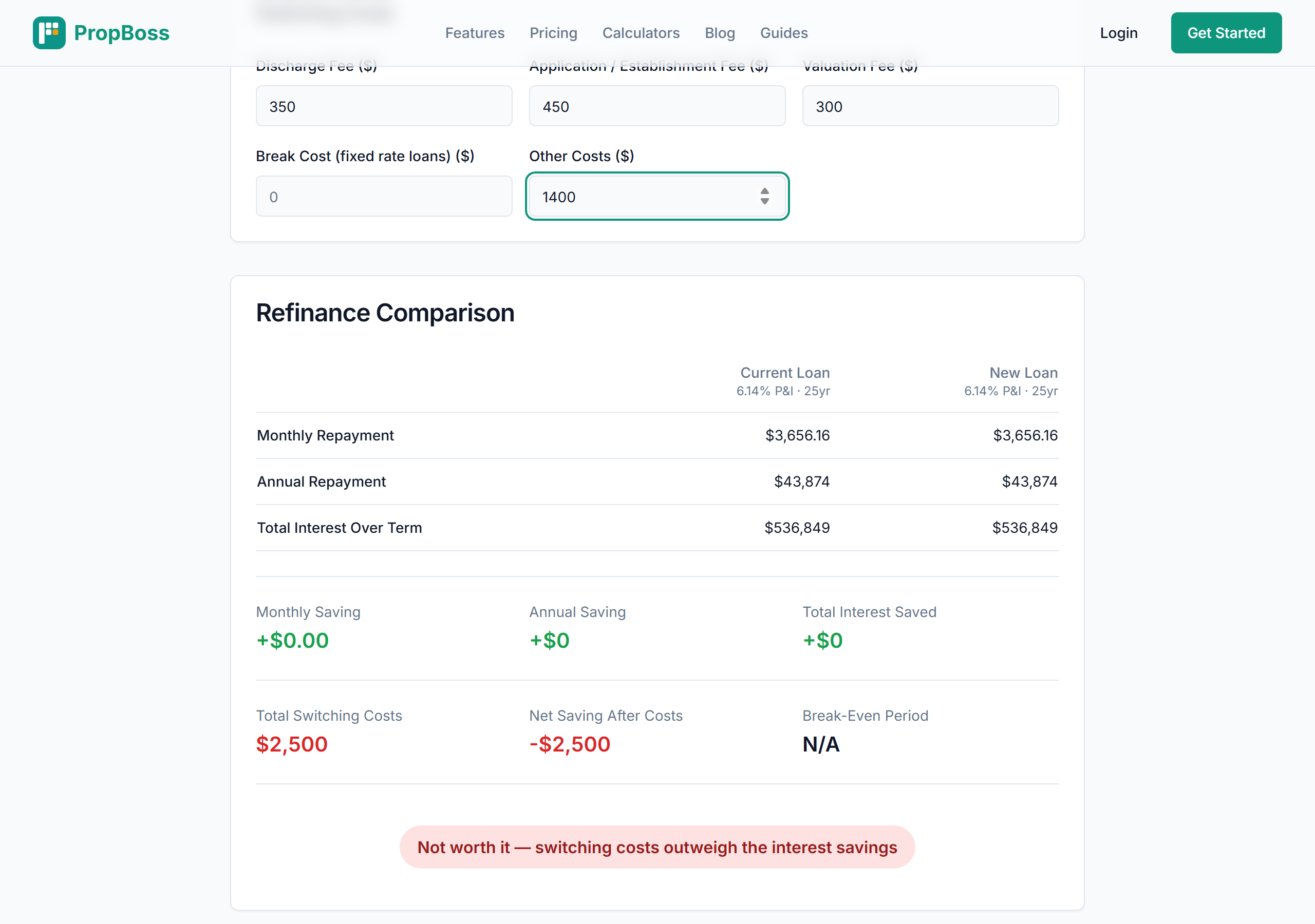 Using the same $560,000 loan balance from the mixed-use example and a $2,500 switching-cost stack, the live PropBoss refinance calculator shows why a refinance still fails the cash-flow test when the rate does not improve. At the same 6.14% rate over 25 years, the calculator holds monthly repayments at $3,656.16, shows annual repayments of $43,874, and leaves the switch $2,500 behind with no break-even point.