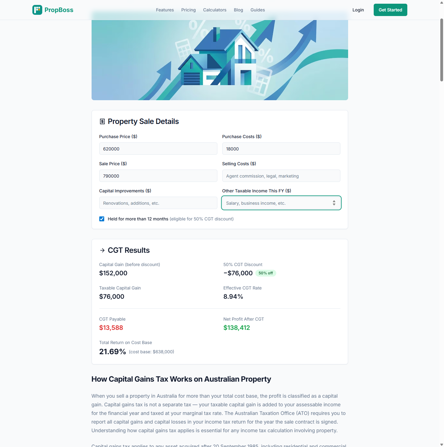 This is where portfolio records matter. PropBoss handles this automatically -- the portfolio return calculator helps track purchase price, sale value, income, costs, and return on investment before your accountant finalises the tax position.